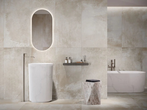 Ces formats permettent de structurer les espaces avec équilibre et modernité, tout en conservant une continuité visuelle harmonieuse. Les bords rectifiés assurent une pose soignée avec des joints fins, idéale pour des surfaces nettes et contemporaines.